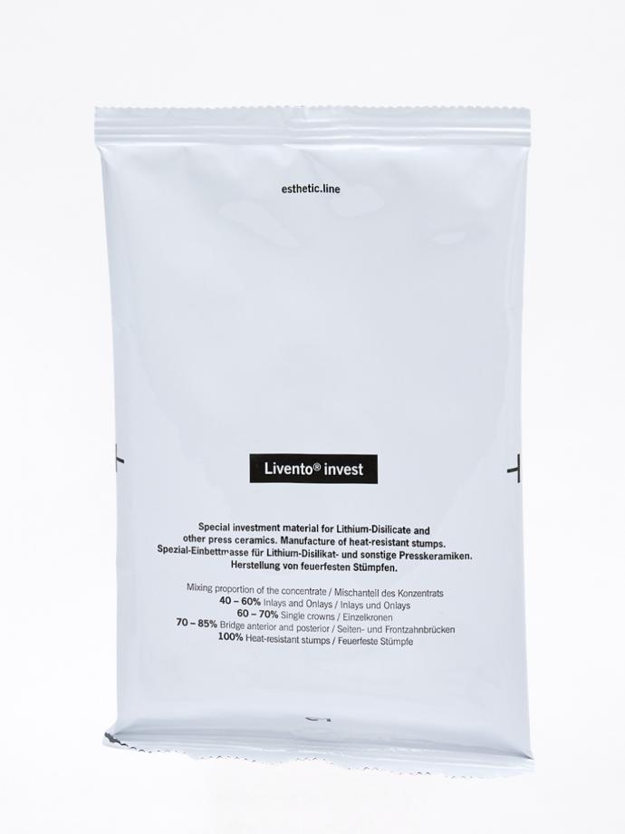 Livento invest Polvere è un rivestimento utilizzato per la tecnica di pressatura del disilicato di litio per la produzione di monconi refrattari. Miscelabile con il liquido Livento Invest Liquid, è mirata all’uso per laboratori odontotecnici.