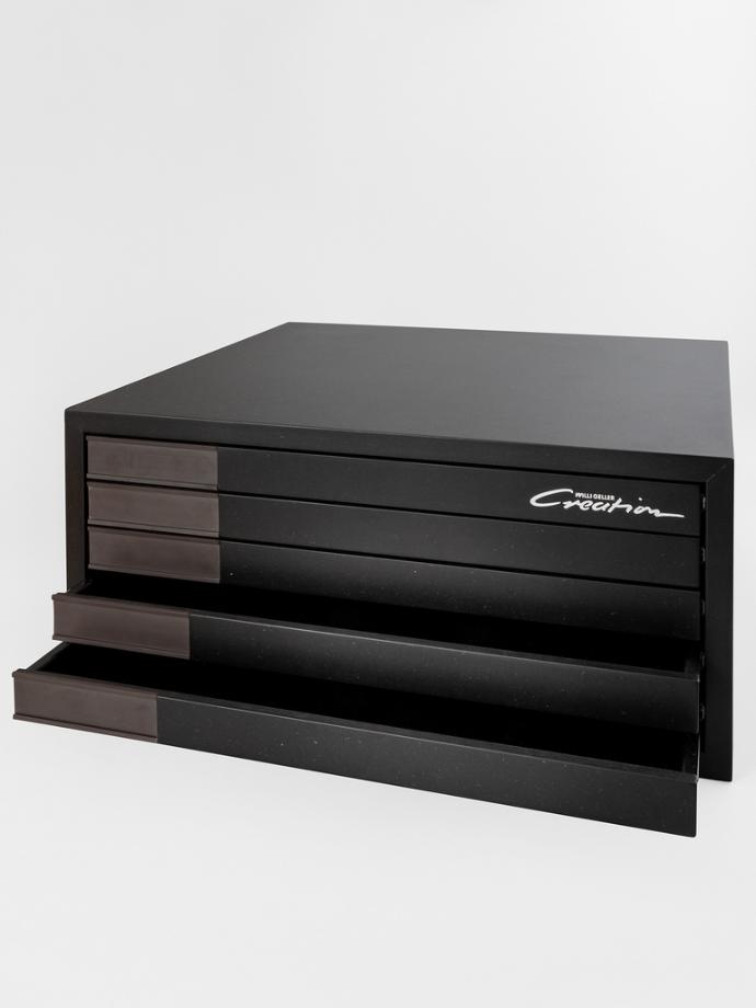 Mobiletto per denti Creation Creopal e Creapearl. Dispone di 5 cassetti per uno spazio sufficiente fino a massimo 300 set di denti (circa 60 set anteriori e 60 set posteriori). I fondi dei cassetti sono in lamiera in alluminio formata, anodizzata nera e si aprono sfiorando leggermente la parte anteriore. Ogni cassetto è dotato di una piastra inseribile in plexglass per le iscrizioni.
