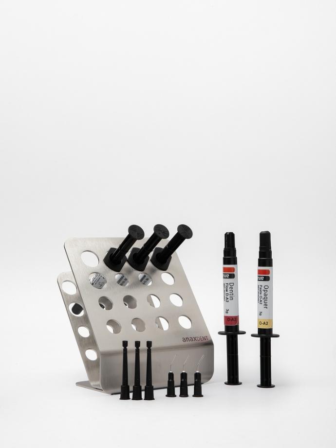 Kit S Flow è il kit di composito fluido di anaxblend con due diverse tonalità di dentina per la stratificazione base del colore e la lavorazione del composito in consistenza liquida (flow).