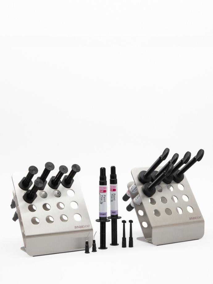 anaxblend è il sistema di rivestimento per restauri dentali a base di materiale composito che unisce masse in pasta di varie durezze con un'ampia varietà di masse fluide. Gli smalti anaxblend hanno una stabilità e una durezza simili allo smalto naturale. Questa caratteristica li rende più rapidi e più facili da lavorare, indipendentemente dal fatto che si scelga pasta o fluido. anaxblend può essere applicato sia modellando mediante tecnica di stratificazione, sia iniettato in fiasche o duplicatori anaxform. Il materiale fluido anaxblend è molto stabile e può essere utilizzato anche per iniezione.